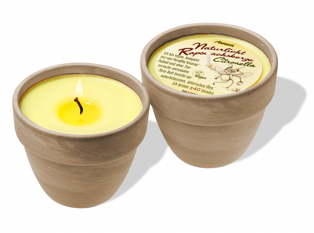 sind biologisch abbaubar. Stuwa Rapskerzen bilden die ökologisch sinnvolle Alternative zu den herkömmlichen Paraffin und Stearin (Palmöl) Kerzen. Die Ökobilanz ist besonders positiv: kurze Transportwege, Gewinnung aus bestehender Kulturfläche und positive CO2 Bilanz. Der gentechnikfreie Anbau von Rapspflanzen hat einen stark positiven Einfluss auf die Entwicklung der Bienenvölker, da Raps einer der besten Nektar- und Pollenlieferanten ist. Rapskerzen bieten allerbeste Brenneigenschaften, hervorragendes Rückhaltevermögen für Duftstoffe (volles Duftaroma) und eine ansprechende Optik. Aus dem schnell nachwachsenden Rapskorn wird das Rapsöl herausgepresst und danach zu Wachs gehärtet. Wir verwenden ausschließlich ungebleichte Baumwolldochte und Duftstoffe, welche aus natürlichen Rohstoffen bestehen. Die Naturlicht Rapswachs Kerzen sind offiziell zertifiziert von der Vegan Society und frei von Tierversuchen. Qualität durch Handarbeit.